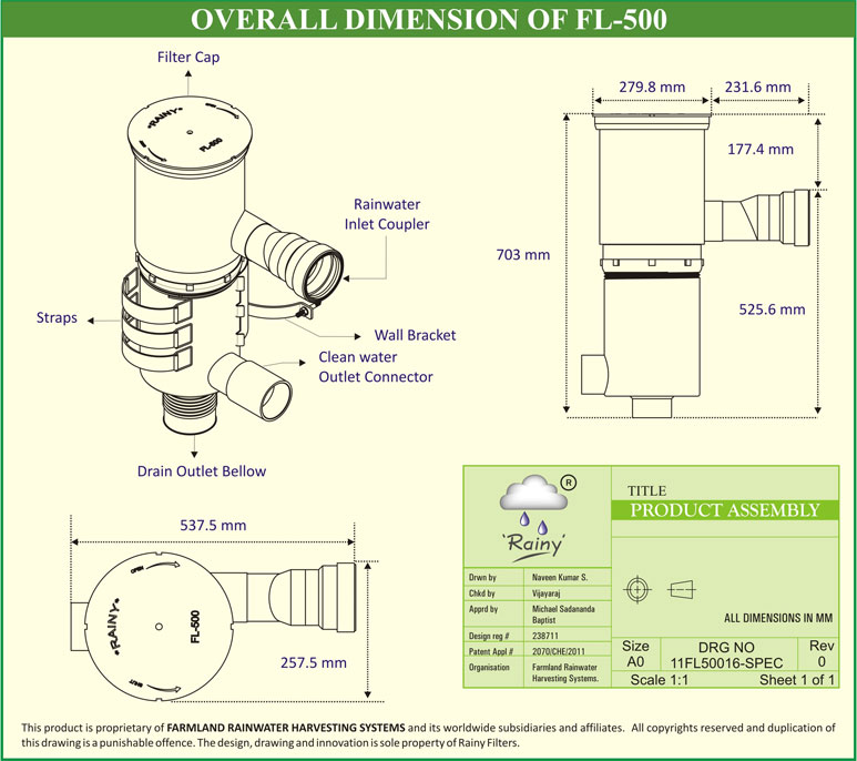 The characteristic features of FL Series Dual Intensity RWH Filter is its capacity to take up the load up to 10 to 500 square meters of Roof area with variable intensity of rainfall of 5 to 75 mm/ hour with a discharge capacity of 10 To 480 Liters per minute. This filter can be conveniently used for Harvesting Rainwater for apartments, Institutions, Hospitals, Commercial Buildings, Industries, Corporate houses of Medium and large sizes.